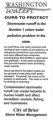 - Educational programs. The Public Works department provides information to schools, businesses, and homeowners groups. For more information please email the public works department at bpworks@ci.brier.wa.us